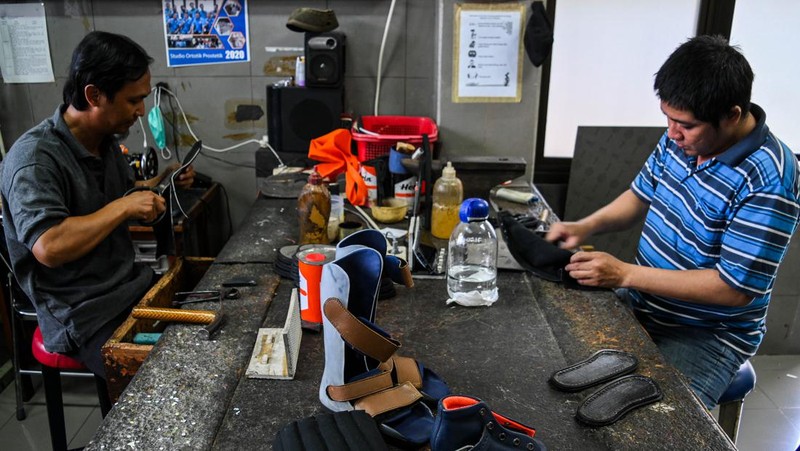 Pekerja membuat sepatu orthopedi di Unit Ortotik Yayasan Pembinaan Anak Cacat (YPAC) Jakarta, Kebayoran Baru, Jakarta, Kamis (18/1/2024).