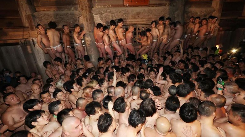 Acara ini dikenal dengan sebutan festival telanjang karena peserta laki-laki hanya mengenakan cawat Jepang yang disebut "fundoshi" dan sepasang kaus kaki putih yang disebut "tabi". (Trevor Williams/Getty Images)