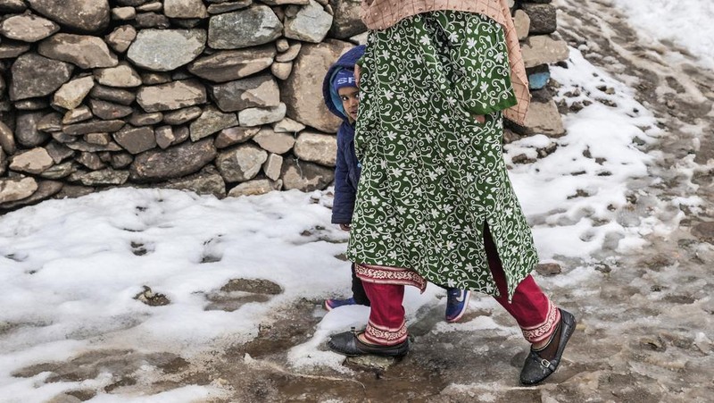 Seorang wanita berjalan bersama anaknya ke lokasi imunisasi polio di pusat kesehatan pemerintah, Srinagar, Kashmir, Minggu (3/3/2024).