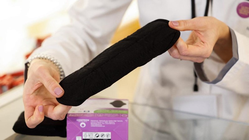 Seorang apoteker menunjukkan pembalut menstruasi yang dapat digunakan kembali di apotek Barcelona, Spanyol, Senin (4/3/2024).