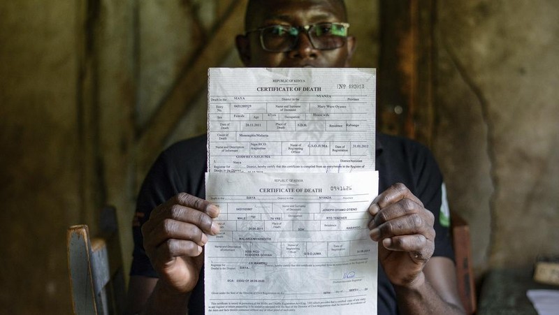 Humphrey Kizito memegang akta kematian orang tuanya yang meninggal karena Malaria di rumah mereka di Siaya, Kenya.