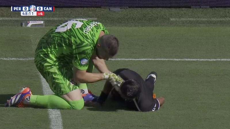Pada paruh pertama pertandingan Copa America Kanada melawan Peru, hakim garis Humberto Panjoj tampak pingsan di bawah sinar matahari langsung di lapangan. (Foto: AP/Ed Zurga)