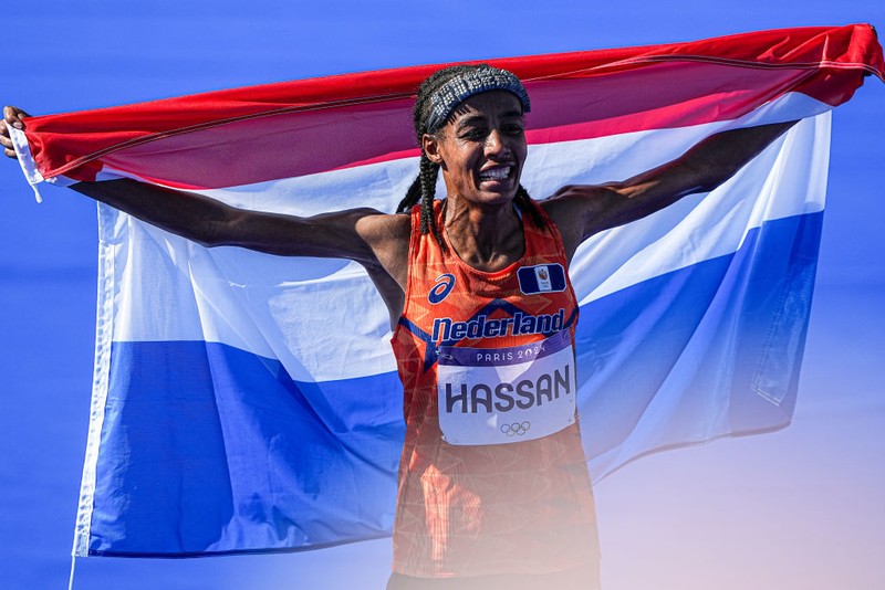 Peraih emas lari marathon putri Olimpade Paris 2024, Sifan Hassan dari Belanda, mengenakan aksesori unik seperti bando dengan tonjolan-tonjolan seperti kristal di bagian dahi. Jelas bukan bando, melainkan headband, tepatnya cooling headband. (Photo By Sam Barnes/Sportsfile via Getty Images)