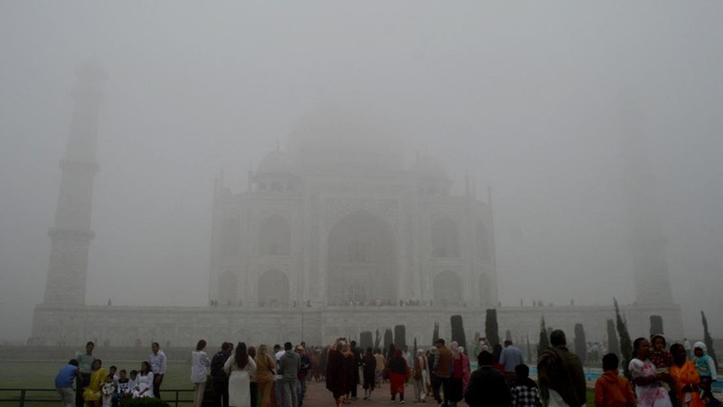 Pengunjung melihat ke arah Taj Mahal di tengah polusi udara dan kabut pagi di Agra, India, Kamis (14/11/2024). Kabut asap beracun yang menyelimuti New Delhi memburuk saat suhu menurun.