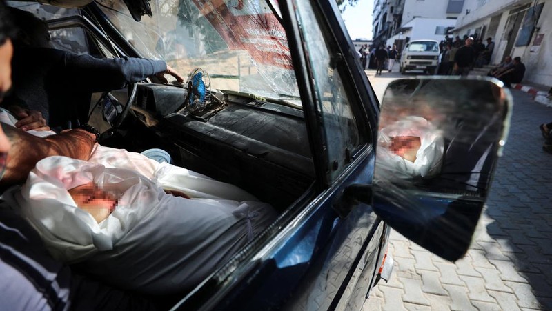 Para pelayat yang duduk di dalam kendaraan membawa jenazah anak-anak Palestina yang tewas dalam serangan Israel selama pemakaman mereka, di rumah sakit Al Shifa, di Kota Gaza. Foto: REUTERS/Mahmoud Issa