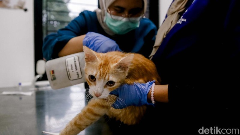 Dokter di Puskeswan Ragunan, Jakarta Selatan, tengah melakukan pengecekan kepada salah satu kucing, Selasa (10/6/2025).