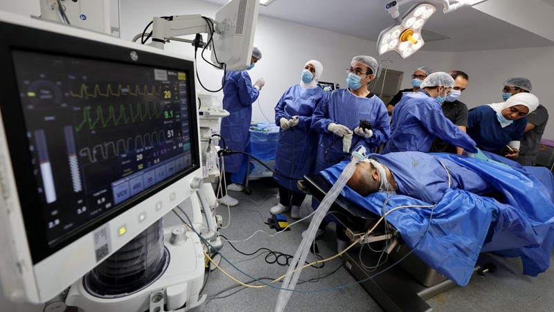 Proses endoskopi berlangsung menggunakan teknik Madkour, yang menawarkan solusi minim invasif bagi pasien akalasia berat. Akalasia adalah kondisi di mana esofagus, saluran yang membawa makanan dari mulut ke lambung, mengalami kesulitan untuk mendorong makanan ke bawah dengan benar. REUTERS/Mohamed Abd El Ghany