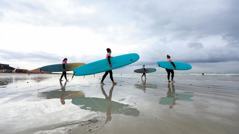 Program ini telah menarik perempuan dari segala usia ke salah satu pantai selancar terpopuler di Afrika Selatan, menciptakan komunitas yang mengutamakan kesejahteraan pribadi dan meninggalkan sejenak peran sebagai ibu. Foto: REUTERS/Esa Alexander