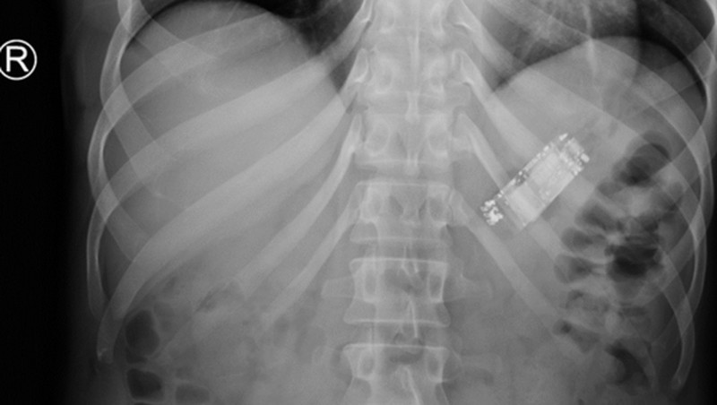 Pasien menolak mengungkapkan apa alasannya menelan ponsel tersebut, tapi menurut laporan petugas penjara, ia diduga berusaha menghilangkan barang bukti. Menelan baterai dapat menyebabkan cedera berat pada saluran pencernaan, karena baterai mengandung logam seperti litium, seng, merkuri, dan nikel. (Foto: Cureus Journal)
