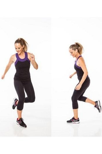 Berdiri dengan kaki terbuka selebar bahu, lutut agak ditekuk dan lengan di samping tubuh. Dorong kaki kanan dan cepat silangkan ke depan kaki kiri, putar pinggang kanan ke depan dan lemparkan tumit kaki kiri di belakang tubuh. Dengan cepat, langkahkan kaki kiri ke bekakang, ke kanan dan kembali ke posisi semula. Lakukan pada sisi yang lain, ulangi sebanyak 10 kali.
