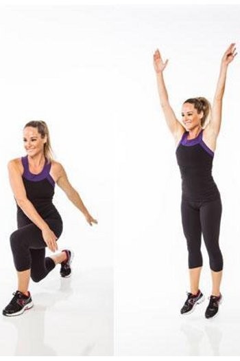Lunges atau gerakan melangkah dimulai dengan berdiri tegak. Langkahkan kaki kanan ke belakang sejauh mungkin dan bawa kedua tangan ke sisi kiri pinggang. Dengan cepat, langkahkan kaki kanan menyusul kaki kiri, lalu angkat kedua tangan begitu kedua kaki bertemu.