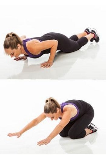 Awali dengan posisi push up termodifikasi, yakni dengan lutut menyentuh lantai. Dengan lengan terbuka lebih lebar dari bahu, tekuk lutut lalu dorong badan ke depan hingga dada hampir menyentuh lantai. Dengan cepat, dorong badan menggunakan tangan ke arah belakang hingga posisi akhirnya seperti berlutut. Lakukan 10 kali pengulangan secepat mungkin.
