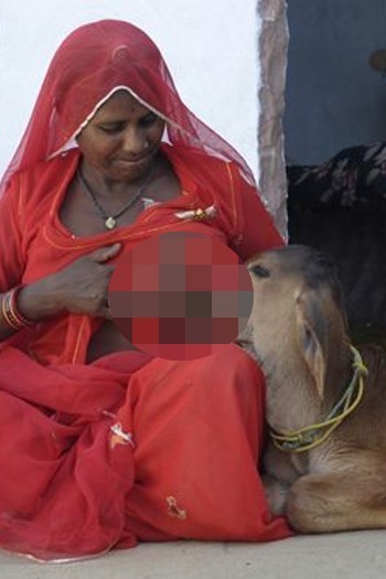 Bai menyusui anak sapi sambil menjaga anaknya yang paling kecil. Si anak sapi terlihat begitu lahap menghisap air susu Bai. Bai mulai menyusui anak sapi setelah induk si sapi mati tiga hari pasca melahirkan. Sejak saat itu, Bai mengenakan pakaian, menyusui, memberi makan serta membesarkan anak sapi sepertinya anaknya sendiri.