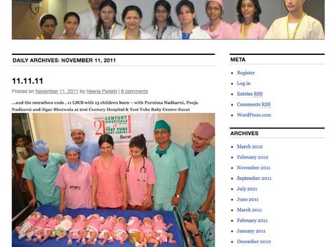 Dikutip dari Times of India, 11 bayi itu lahir pada tanggal cantik 11 November 2011 dengan bantuan dr Purnima Nadkarni dan dr Pooja Nadkarni serta tim dokter lainnya. Bayi-bayi itu berasal dari 11 pasang orang tua yang menjalani prosedur In Vitro Fertilization (IVF). Foto 11 bayi yang dijajarkan bersama itu telah dipublikasikan di nadkarniivf.wordpress.com/