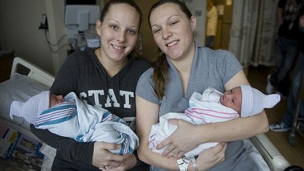 Kembar asal New Jersey ini lahir dalam jarak waktu 12 menit saja. Namun saat mengandung, mereka memutuskan merahasiakannya satu sama lain. Tak tahunya pada bulan Desember 2011, keduanya sama-sama melahirkan anak laki-laki dengan jarak hanya 13 menit saja.