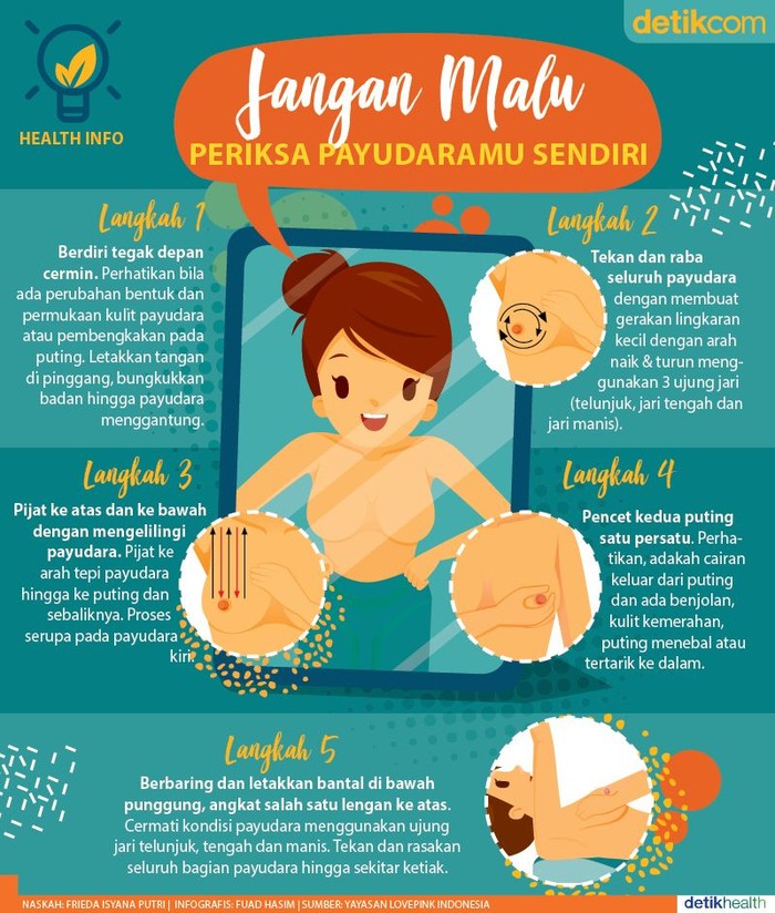 Jakarta - Tak perlu malu! Memeriksa payudara sendiri sangat penting untuk deteksi dini adanya kanker. Yuk pahami dan lakukan SADARI lewat langkah-langkah berikut.