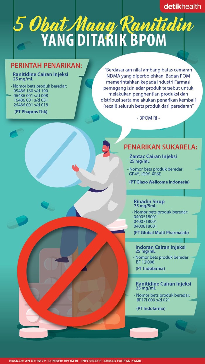 Jakarta - Sejumlah produk obat maag dan asam lambung ranitidin ditarik BPOM. Obat tersebut terkontaminasi N-Nitrosodimethylamine (NDMA) yang terkait kanker.