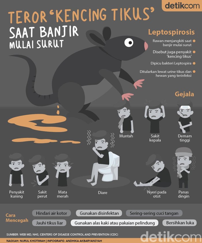 Jakarta - Leptospirosis atau penyakit kencing tikus bermunculan justru saat banjir mulai surut. Bersih-bersih dengan disinfektan bisa mencegah infeksi tersebut.