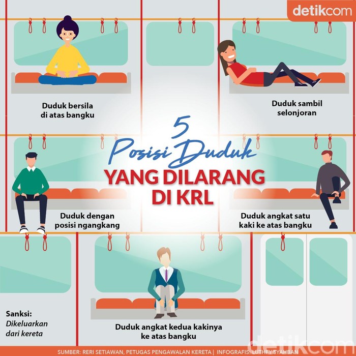 Jakarta - Duduk ngangkang saat kereta penuh bukan cuma menyebalkan. Perilaku ini ternyata memang dilarang, dan sanksi bila melanggar bisa dikeluarkan dari gerbong.