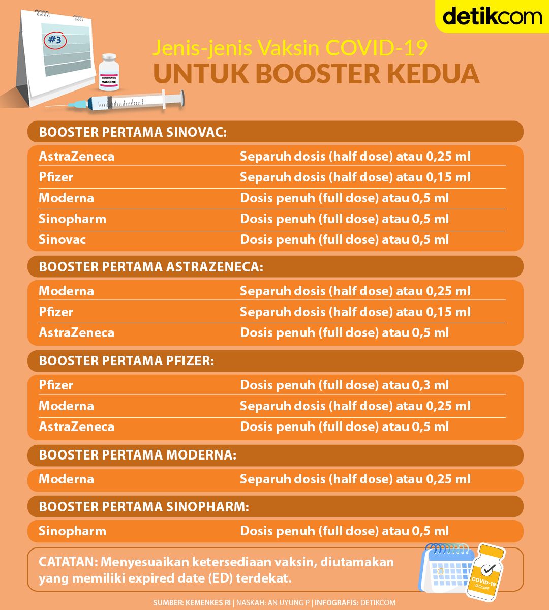 Booster kedua vaksin COVID-19 alias dosis keempat sudah dimulai untuk tenaga kesehatan. Kombinasi jenis vaksin yang digunakan bisa dicek di sini.