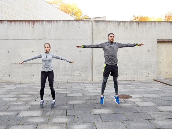 Untuk melakukannya, berdiri tegak dengan posisi kaki rapat dan tangan di samping tubuh. Angkat kedua lengan dengan cepat ke atas kepala sambil melompat ke samping. Segera lakukan gerakan sebaliknya untuk lompat kembali ke posisi berdiri. Lakukan gerakan ini secara berulang, dengan hitungan 10 hingga 15 kali.