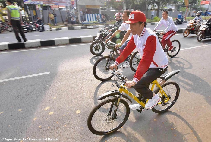 Selain berjalan kaki, Jokowi juga senang bersepeda. Jika ada waktu senggang, ia kerap berkeliling dengan sepeda. Bahkan bersepeda dengan keluarga juga.