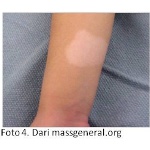 Banyak pula dari pasien yang hanya menunjukkan tanda putih seperti panu dengan ukuran besar di beberapa bagian tubuhnya (Foto 4 - disebut hypomelanotic macules).