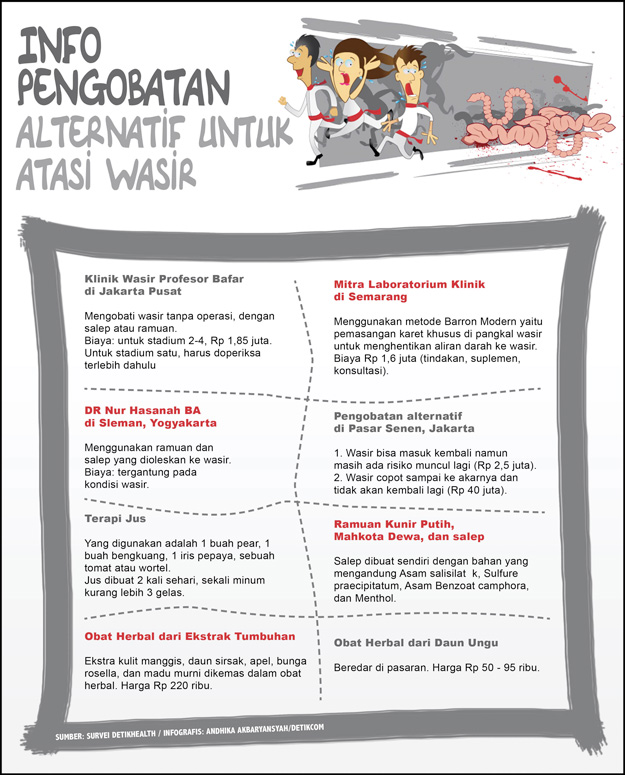 Namun tak sedikit pula orang yang memilih untuk mengatasi wasirnya dengan jalan alternatif alias non-medis. Tak heran banyak klinik pengobatan alternatif yang menawarkan jasa mengatasi wasir tanpa operasi.